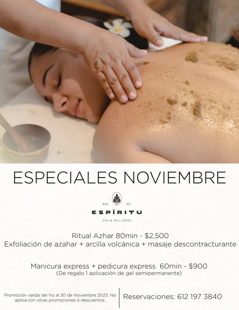- Ritual Azahar (80 min) — $2,500 MXN (Exfoliación de azahar con arcilla volcánica y masaje descontracturante).